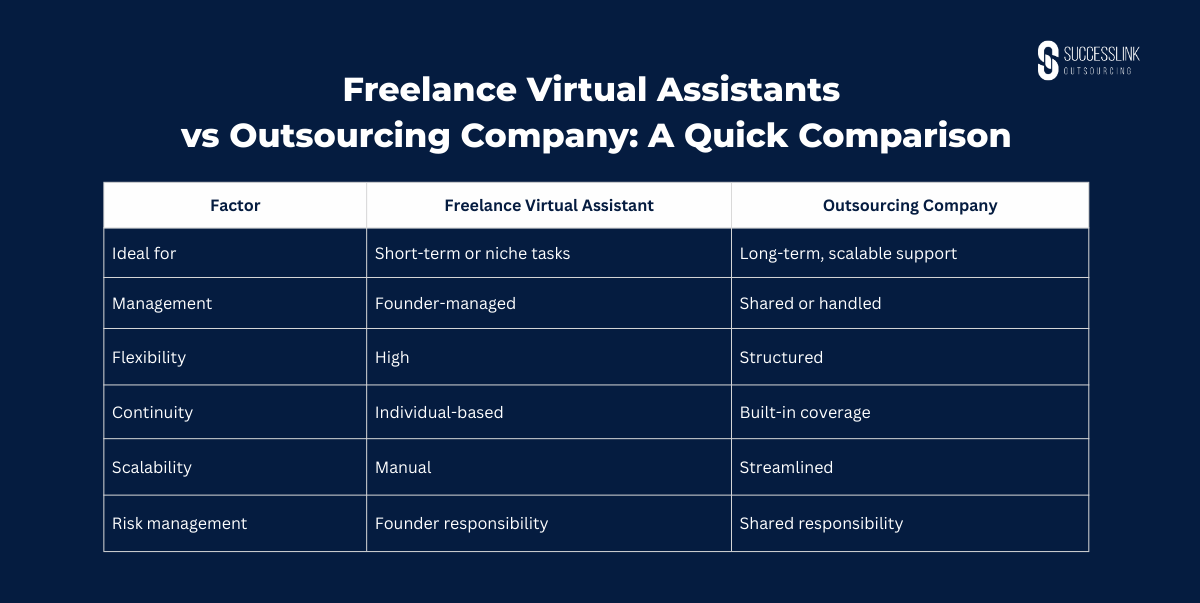 As your company evolves, many founders even use both: freelancers for specialized projects and an outsourcing company for core, ongoing virtual assistant support.